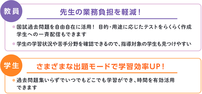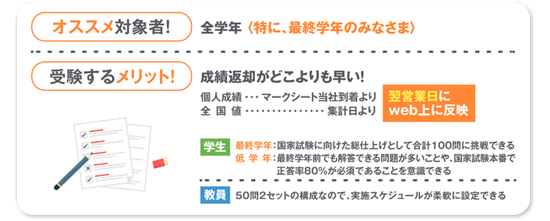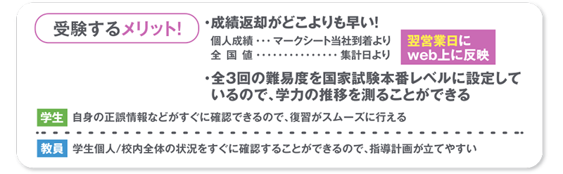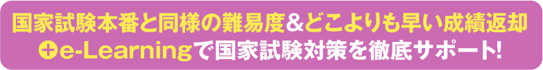 国家試験の動向を分析し、大学教員と国家試験対策のプロがタッグを組んで問題作成を行っています。本番同様の問題構成・難易度の試験とどこよりも早い成績返却が国家試験合格の手助けとなります。セット受験により受験料の割引とe-Learningの無料提供で、国試合格を徹底サポートします。