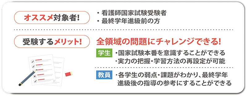 国家試験の最新情報はもちろん、臨床現場の状況も鑑みて問題作成にあたっています。国家試験対策や実習前の知識確認にお使いいただける模擬試験となっています。