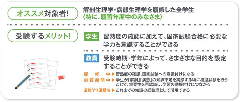 「解剖」「病態」の知識は、看護につなげられてこそ習得したといえます。科目別実力テストは、国家試験本番を想定して作成しています。低学年で受験することで、履修した内容の確認だけでなく、実習やその後の国試対策につなげることができます。