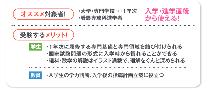 これから看護を学んでいくうえで必須となる知識・学力を4科目の問題を通して確認し、学習を深められる模擬試験です。看護師国家試験の過去問題を、入学直後の学生でも解けるようにアレンジしています。