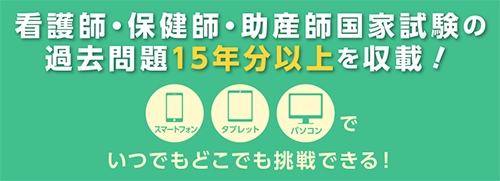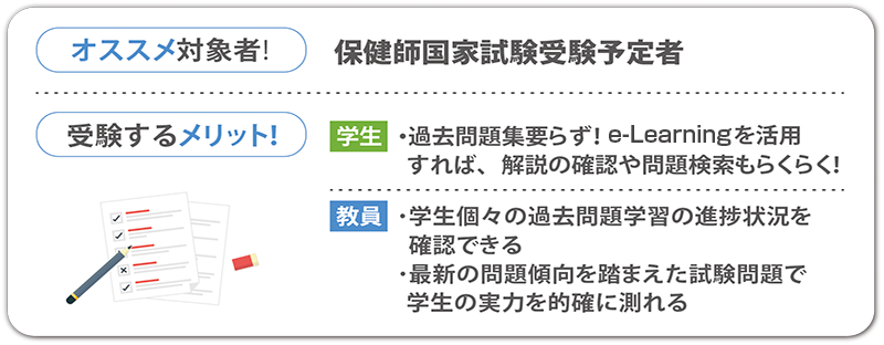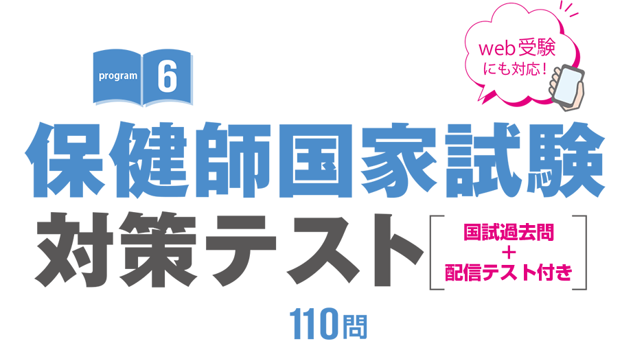 模擬試験のお申し込み特典として、国家試験過去問題集を収載したE-Learning「国試過去問+配信テスト」を提供しています。最新の動向を踏まえて制作された模擬試験の受験と合わせて、過去問にも取り組めば、保健師国家試験対策は万全です。